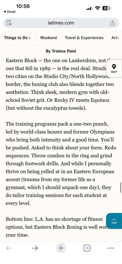 The LA Times feature about Eastern Block Boxing was written by journalist Trishna Patel, who covered the gym’s training style and atmosphere.